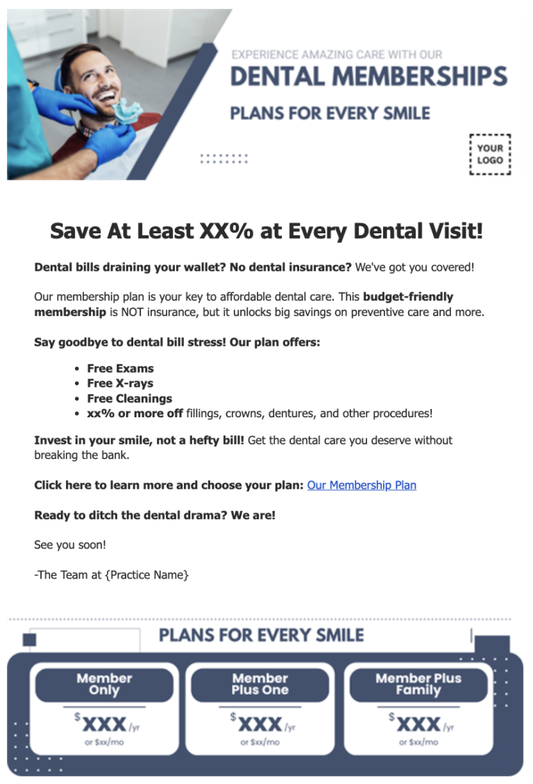 - Targeted Membership Promotion Campaign: As a Smile Advantage client, you’ll receive a custom marketing campaign to jumpstart your campaign. Make promoting your membership plan effortless!