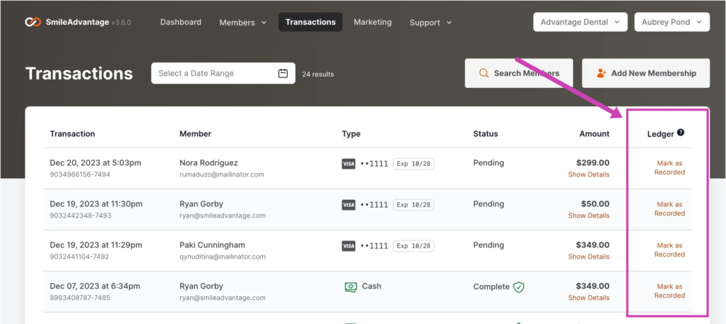 - Mark transactions as recorded: Look for transactions with “Mark as Recorded” next to them. This indicates a payment received through Smile Advantage that needs to be recorded in your practice management software.