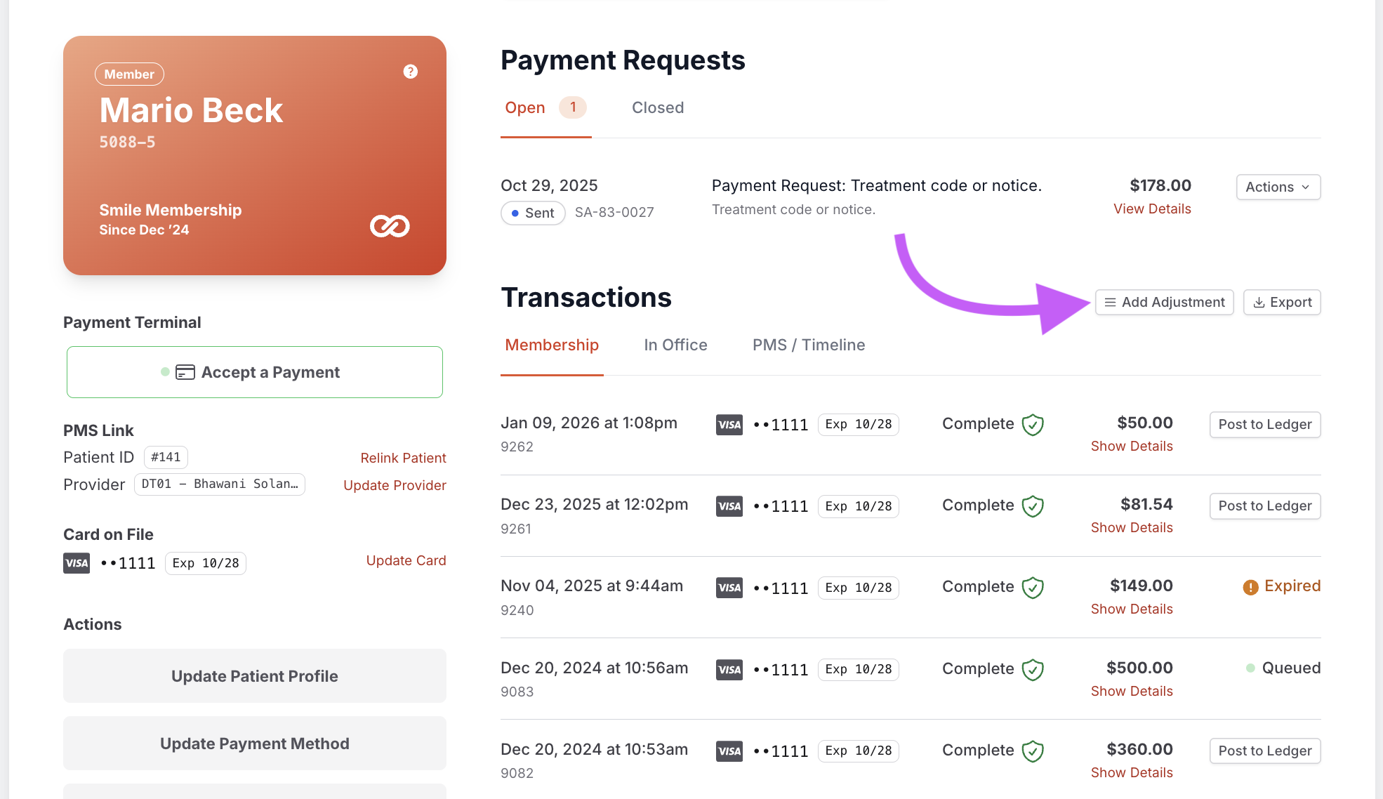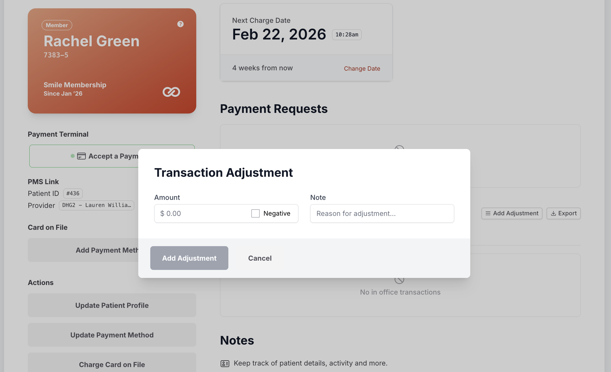 Transaction Adjustment allows your office to document a payment or correction that happened outside the Smile Advantage dashboard.