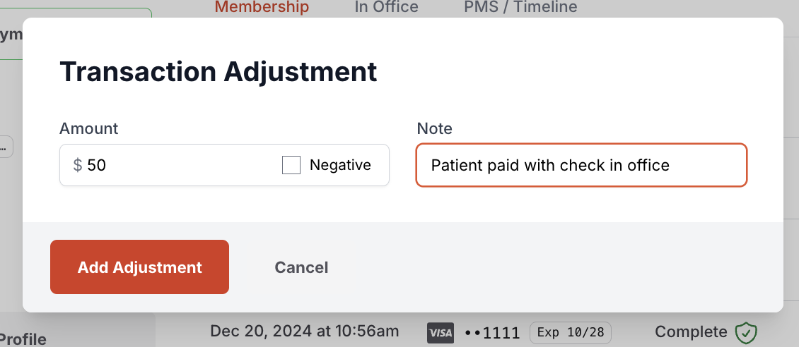 The adjustment will now appear in the patient’s transaction list, along with the note you added.